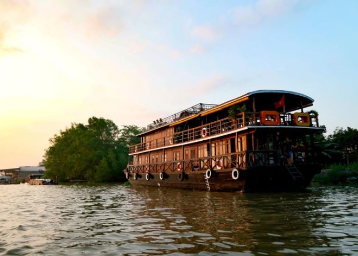 Rejoindre à notre grand bateau où vous allez prendre le déjeuner tandis que notre bateau se met sa route vers Sadec, une ville charmante située au bord du fleuve de Tien.