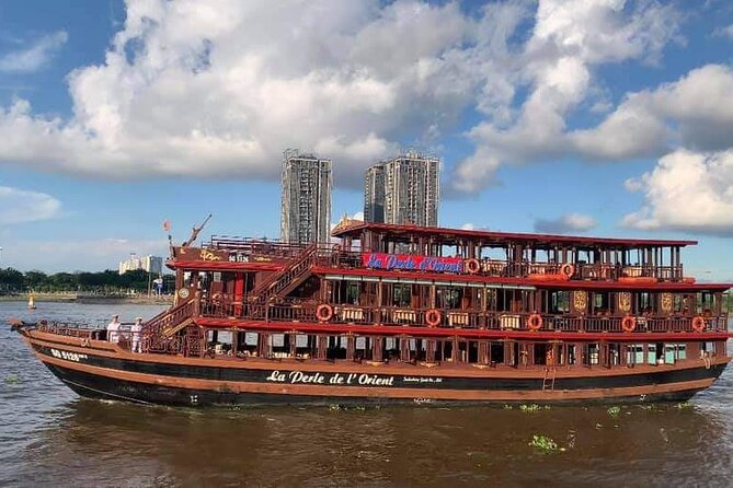 Notre guide vous accueillera à 18h30 de votre hôtel à Ho Chi Minh Ville et départ au port Bach Dang. Puis, embarquement à bord du bateau pour un diner-croisière sur le fleuve de Saigon. Vous profiterez d'une belle croisière de 02h et d'un repas gastronomique en écoutant les mélodies de la musique authentique. Le capitaine vous accueillera à bord et vous présentera les spécialités culinaires faites par un cuisinier connu d'Ho Chi Minh Ville. Une fois à bord, vous pourrez vous relaxer sur le pont et profiter d'une vue panoramique de la ville lumineuse et moderne d'Ho Chi Minh. Fin du dîner-croisière, reprise du véhicule pour le retour à votre hôtel.
