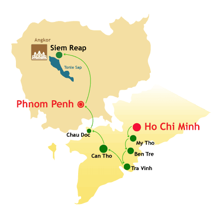 Jour 1 : Saigon - Découverte Jour 2 : Saigon - My Tho - Ben Tre - Tra Vinh Jour 3 : Tra Vinh - Découverte - Can Tho Jour 4 : Can Tho - Parc Ornithologique de Tra Su Jour 5 : Chau Doc - Phnompenh Jour 6 : Phnompenh - Siemreap Jour 7 : Siemreap - Angkor Jour 8 : Siemreap - Angkor Jour 9 : Siemreap - Départ |