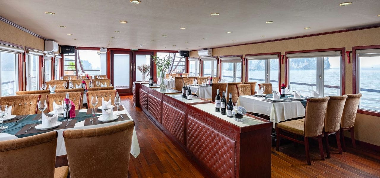 Le déjeuner est servi alors que le bateau traverse la splendide baie d’Halong, croisant en particulier l’île du chien de pierre, l’île du doigt, l’île encensoir, l’île des coqs de combat, la plage de Soi Sim et l’ile des cocotiers.